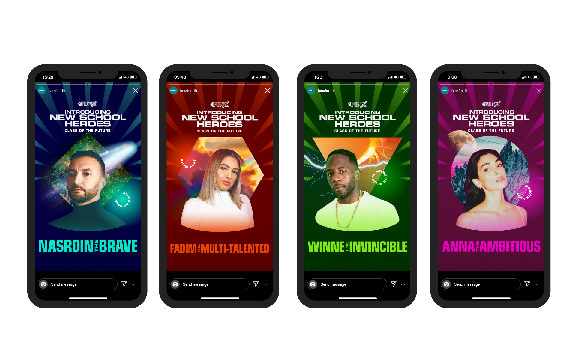 FunX vroeg Friends For Brands om de naam, aansprekende branding en een storytelling-aanpak voor deze College Tour te ontwikkelen. De helden in de oude schoolboeken zijn niet de helden die tot de verbeelding van deze nieuwe generatie spreken. Sterker nog, door de ogen van deze doelgroep zijn dit vaak antihelden. Daarom introduceren we de rolmodellen Winston Bergwijn, Nasrdin Dchar, Anna Nooshin en Fadim Kurt als New School Heroes. In een stijl geïnspireerd op heroïsche tv-shows en games, focussen we op de superkrachten van de speakers.