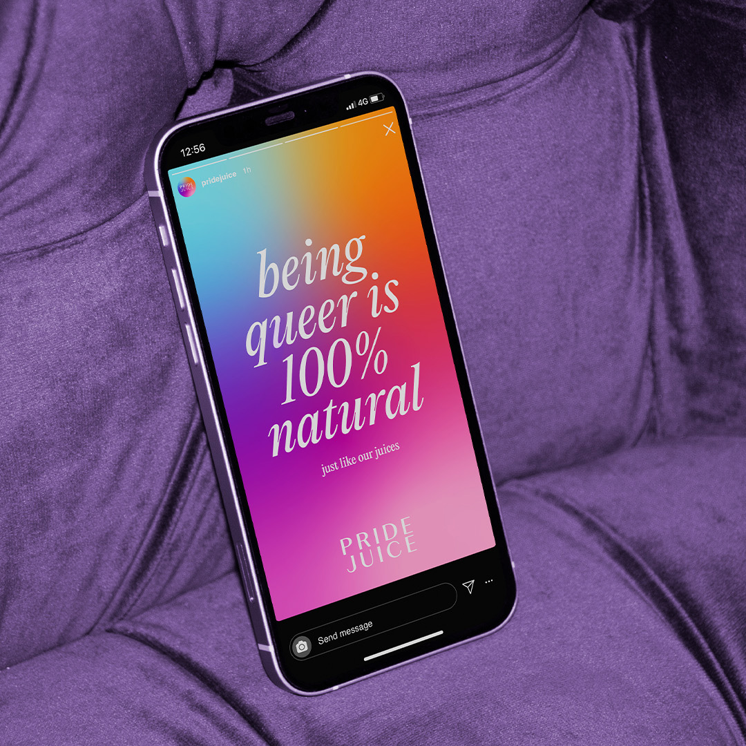 Met het concept ‘Tasty by Nature’ laten we zien hoe lekker en verrassend de natuur is. En vertellen we dat queer zijn, zoals de juice, ook 100% natuurlijk is. Maar hoewel dit in de ‘stad’ vanzelfsprekender lijkt te zijn dan vroeger, merkt de queer community op het platteland nog vaker dat dit niet door iedereen wordt geaccepteert. Om écht impact te maken, stelden we daarom met onze impactstrategie voor dat een deel van de opbrengsten van Pride Juice gaat naar organisaties die zich inzetten voor queer jongeren op het platteland.